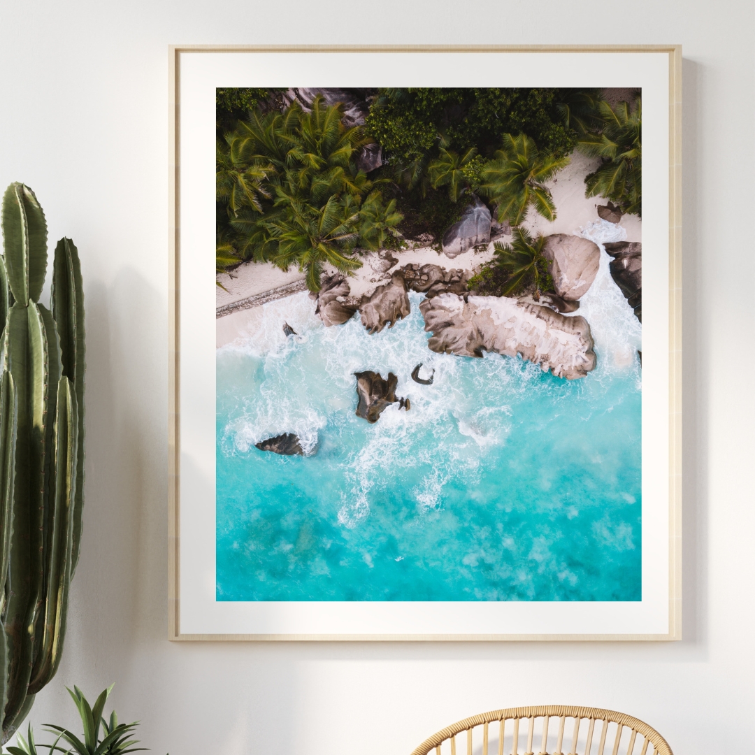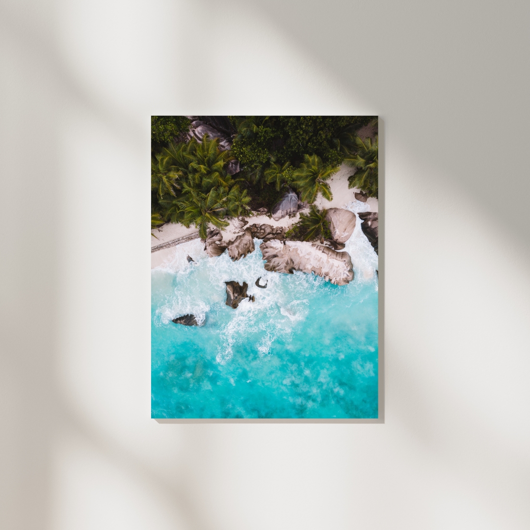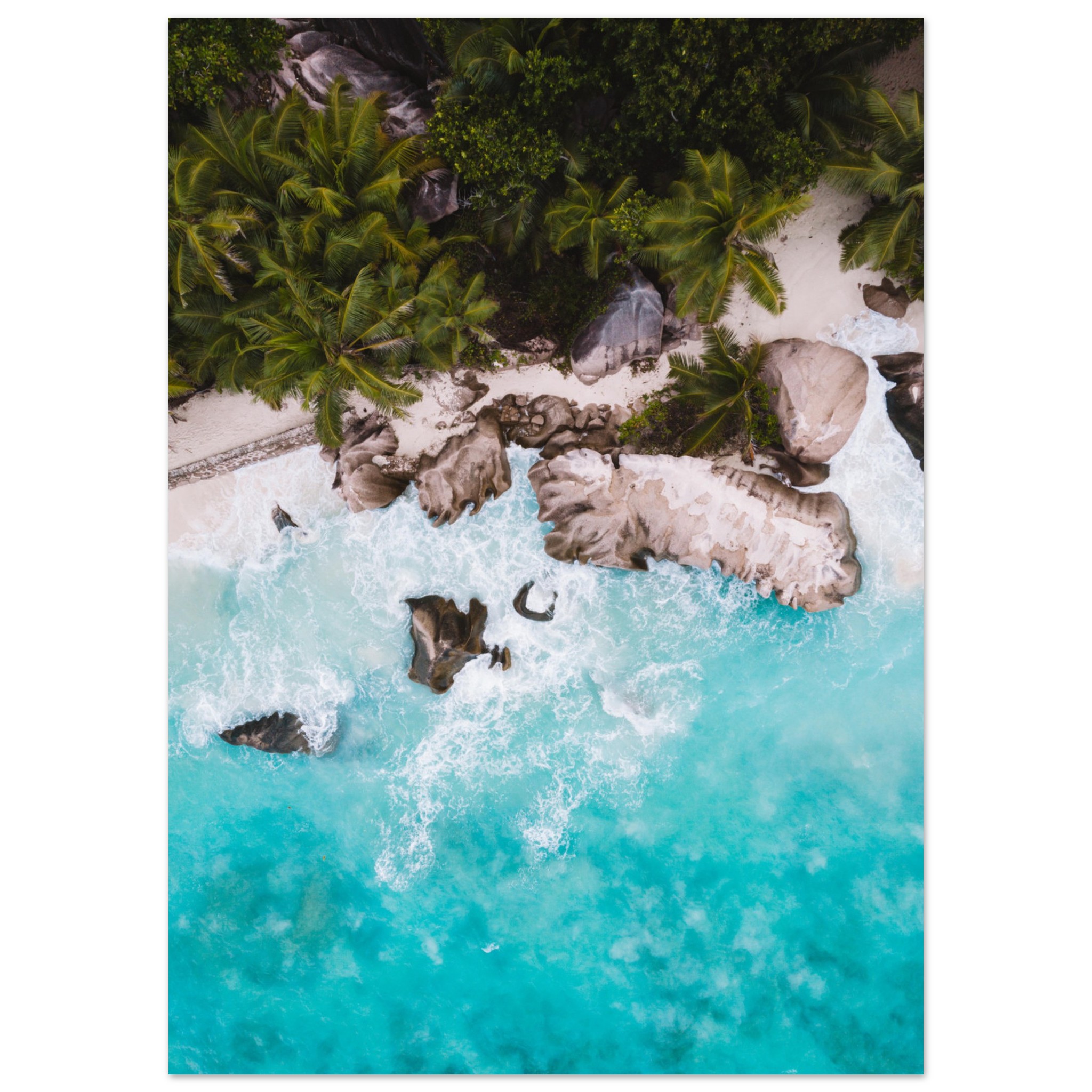 Poster mit Drohnenfotografie der Anse Source d’Argent auf der Insel La Digue, Seychellen. Die Anse Source d’Argent mit ihrem feinen Sand, den riesigen Granitfelsen und den tiefgrünen Palmen gilt als einer der schönsten Strände der Welt.