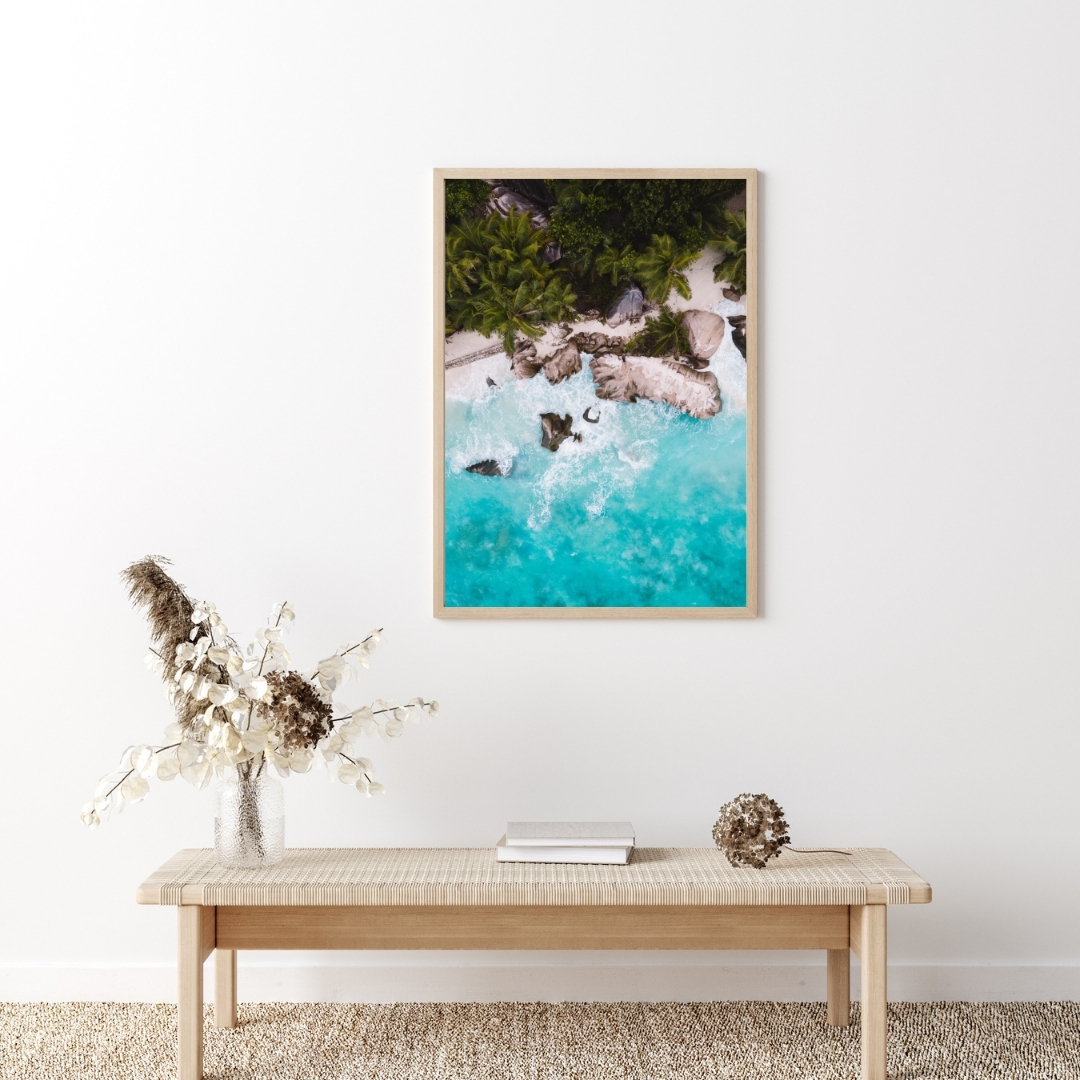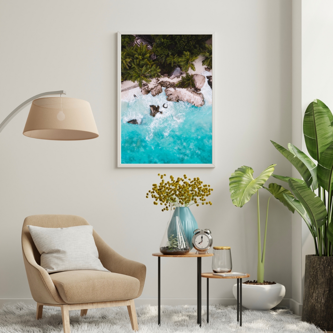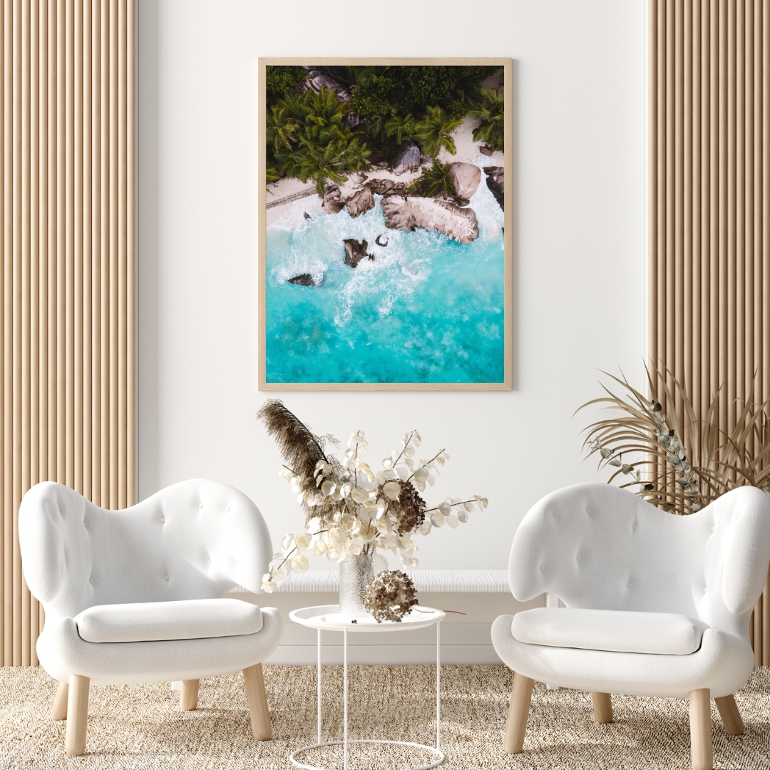 Poster mit Drohnenfotografie der Anse Source d’Argent auf der Insel La Digue, Seychellen. Die Anse Source d’Argent mit ihrem feinen Sand, den riesigen Granitfelsen und den tiefgrünen Palmen gilt als einer der schönsten Strände der Welt.