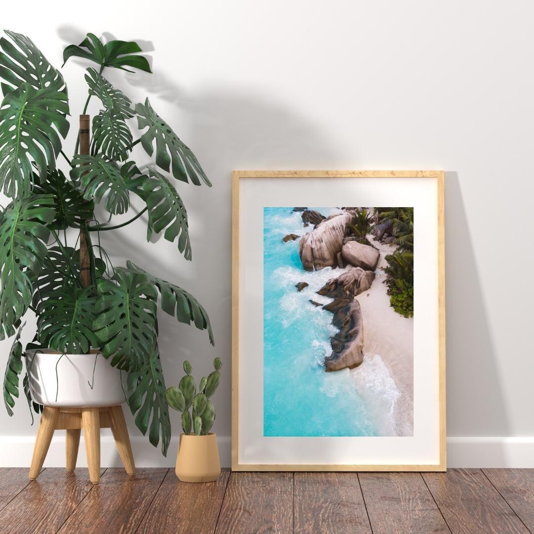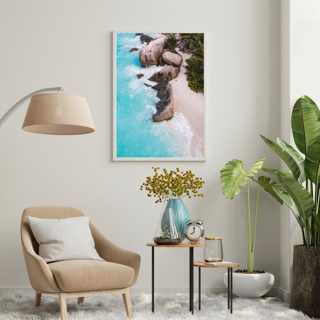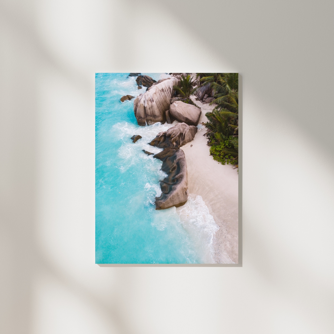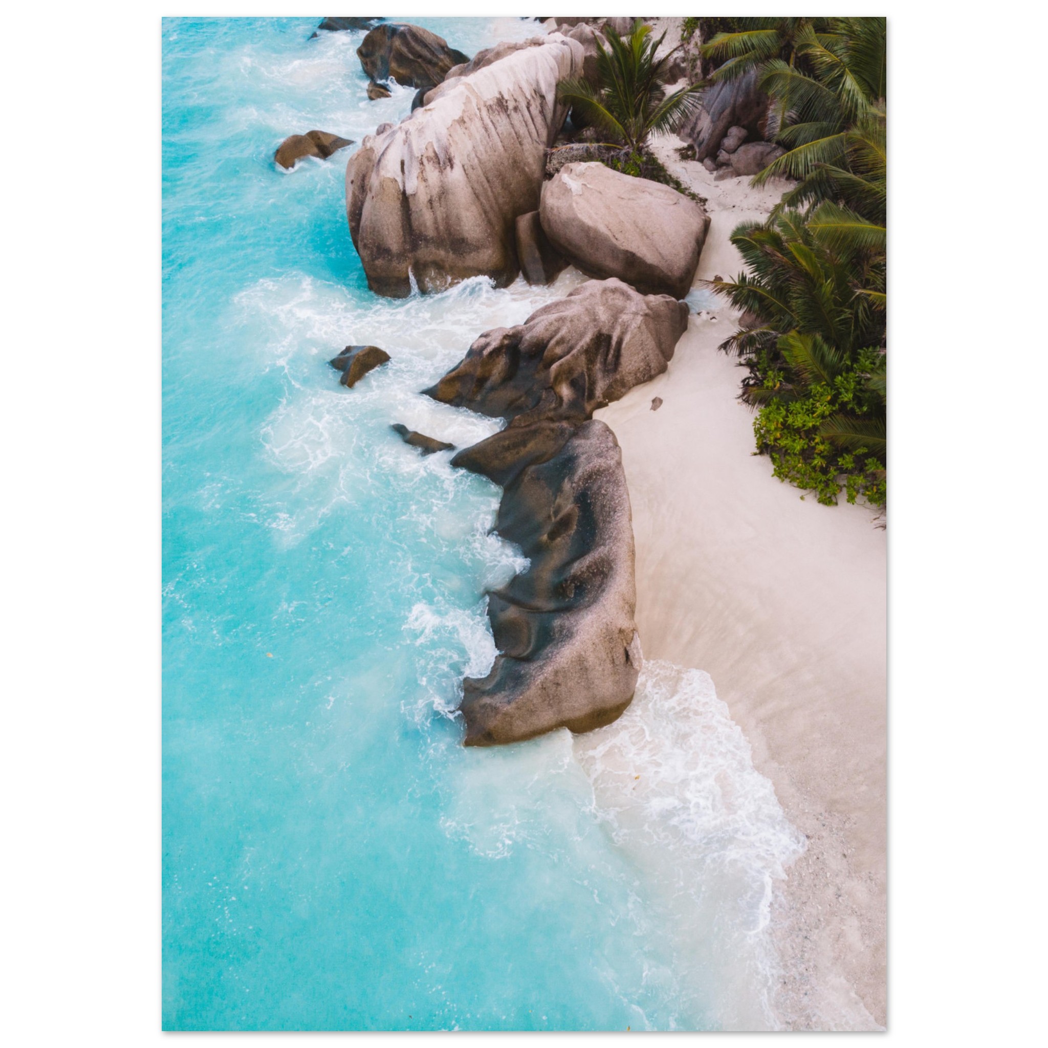 Poster mit Drohnenfotografie der Anse Source d’Argent auf der Insel La Digue, Seychellen. Die Anse Source d’Argent mit ihrem feinen Sand, den riesigen Granitfelsen und den tiefgrünen Palmen gilt als einer der schönsten Strände der Welt.