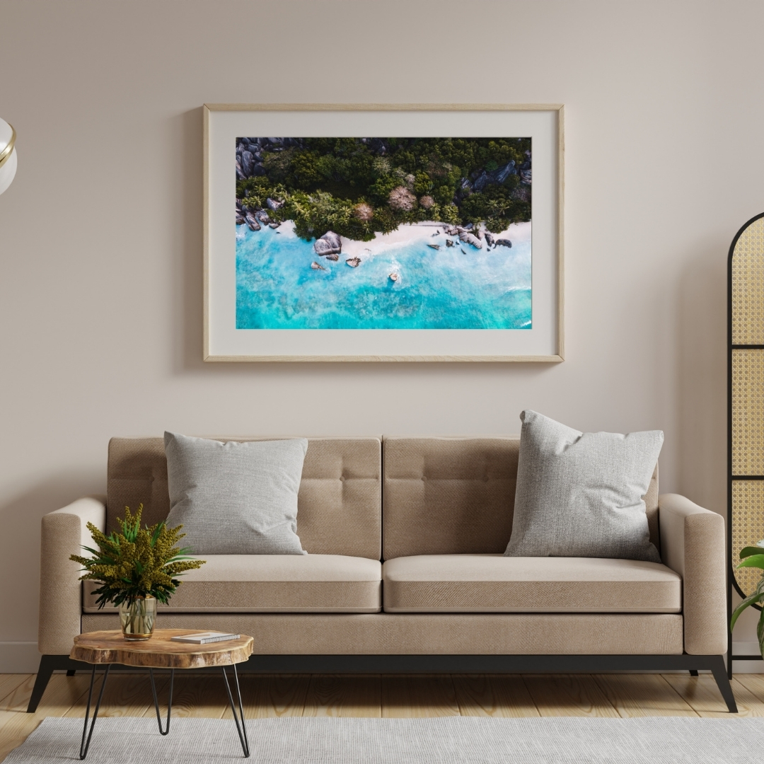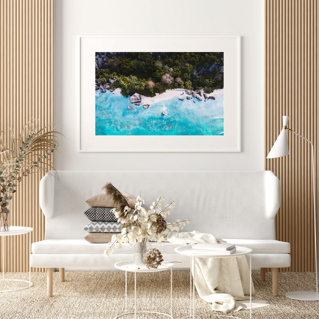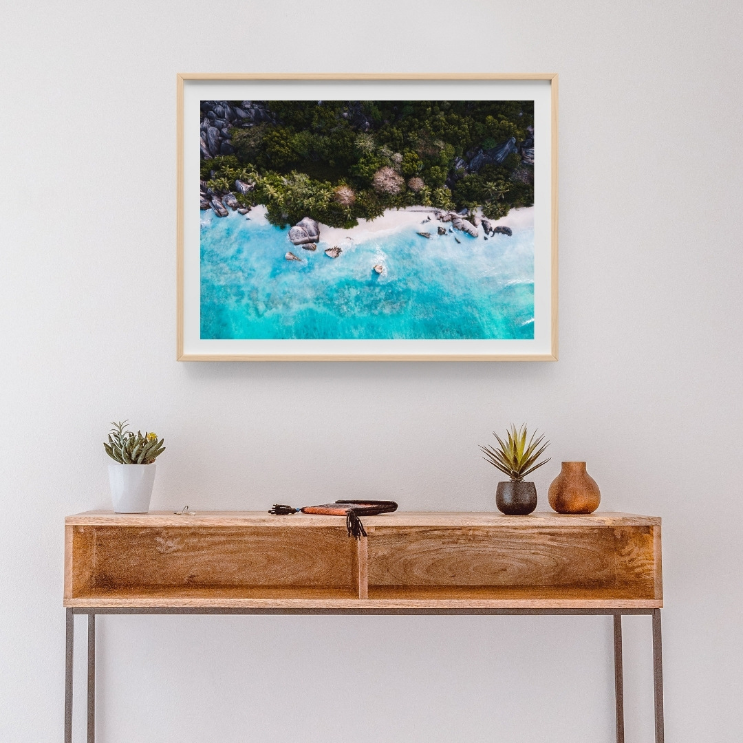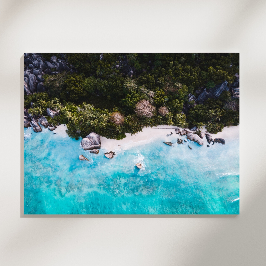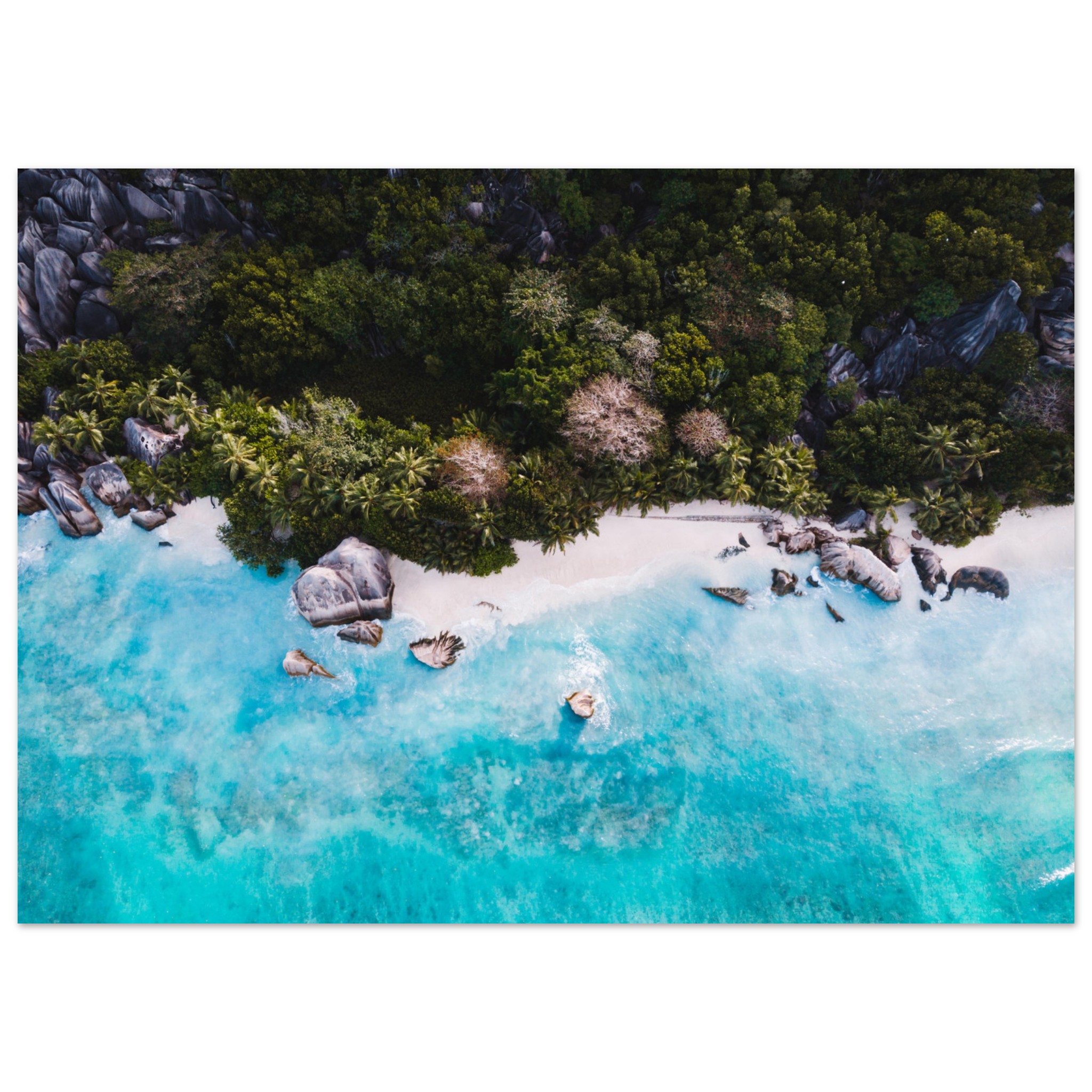 Poster mit Drohnenfotografie der Anse Source d’Argent auf der Insel La Digue, Seychellen. Die Anse Source d’Argent mit ihrem feinen Sand, den riesigen Granitfelsen und den tiefgrünen Palmen gilt als einer der schönsten Strände der Welt.
