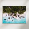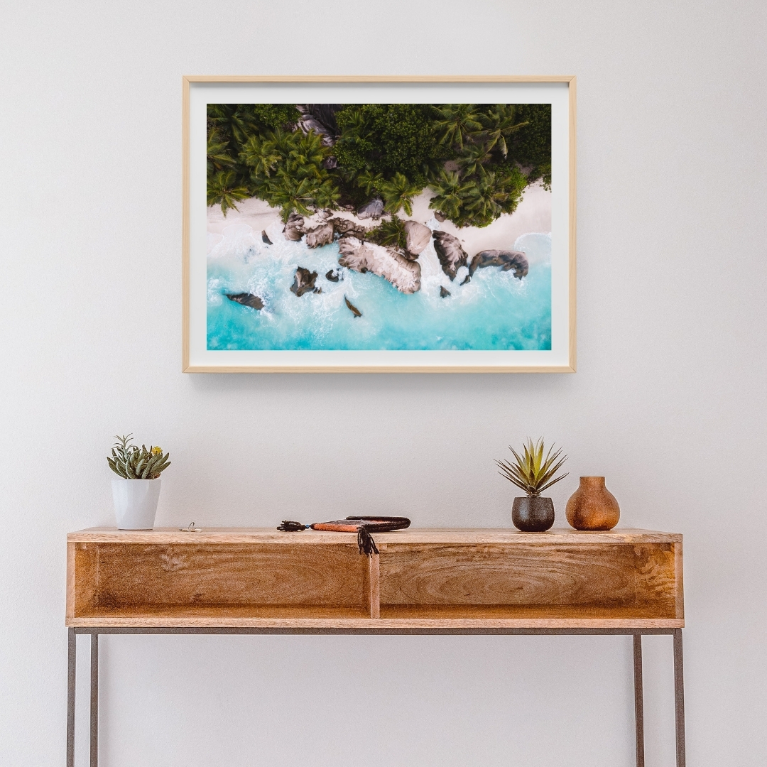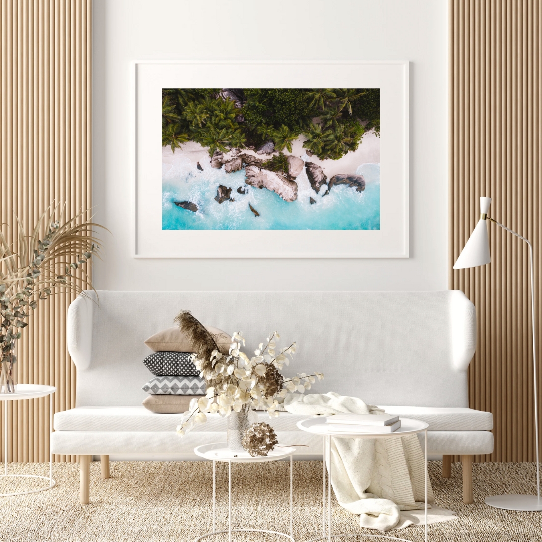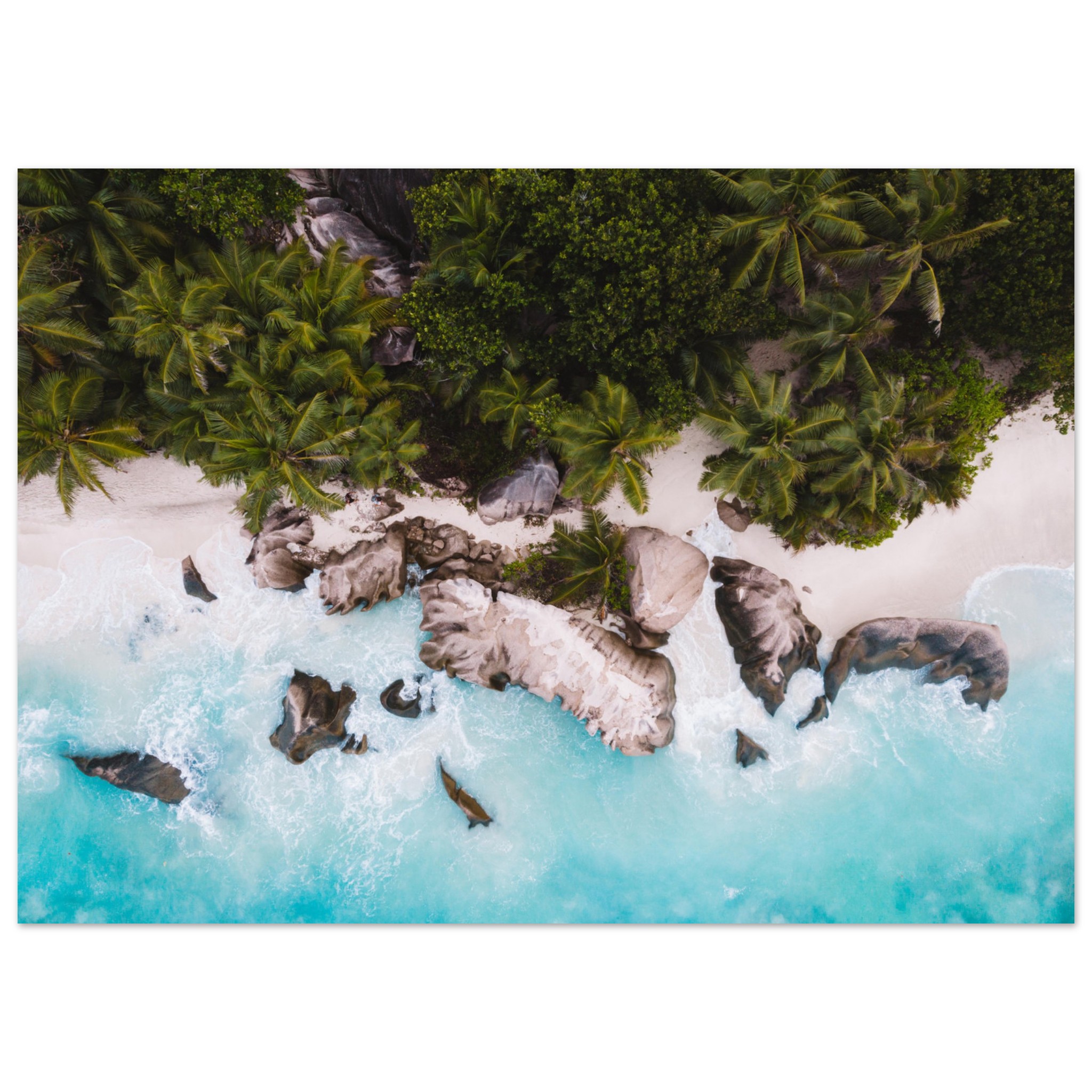 Poster mit Drohnenfotografie der Anse Source d’Argent auf der Insel La Digue, Seychellen. Die Anse Source d’Argent mit ihrem feinen Sand, den riesigen Granitfelsen und den tiefgrünen Palmen gilt als einer der schönsten Strände der Welt.