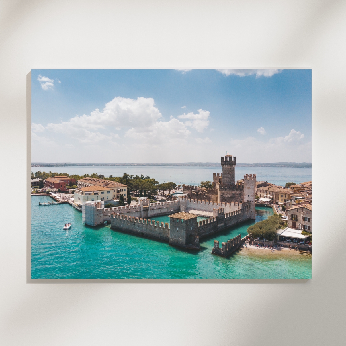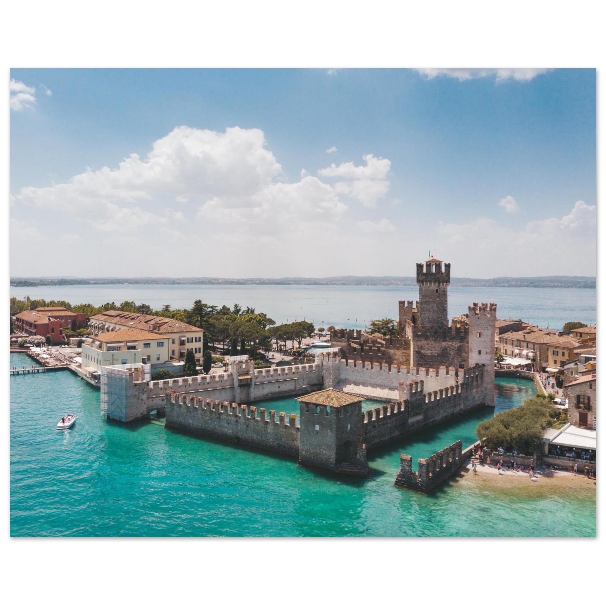 Dieses Bild zeigt die Scaligerburg von Sirmione eingebettet in das lebendige Blau des Sees. Das Wasser umfließt die quadratischen Mauern, Licht und Schatten lassen die Struktur der Burg auch aus der Distanz klar wirken. Falls du aus der Bodenperspektive bereits beeindruckt warst von diesem einzigartigen Bauwerk am Gardasee, dann ist die Vogelperspektive dieser Aufnahme sicher nicht weniger imposant.