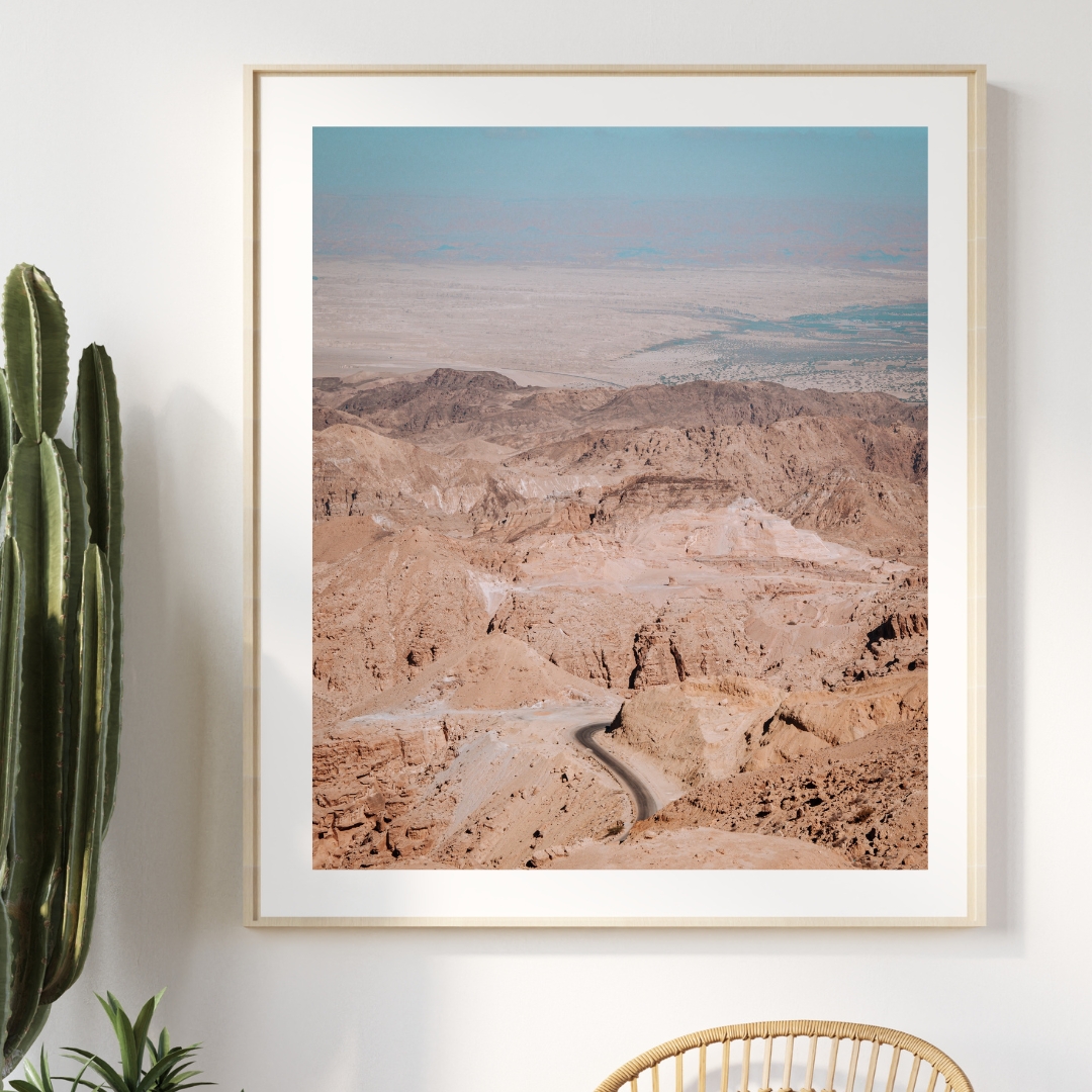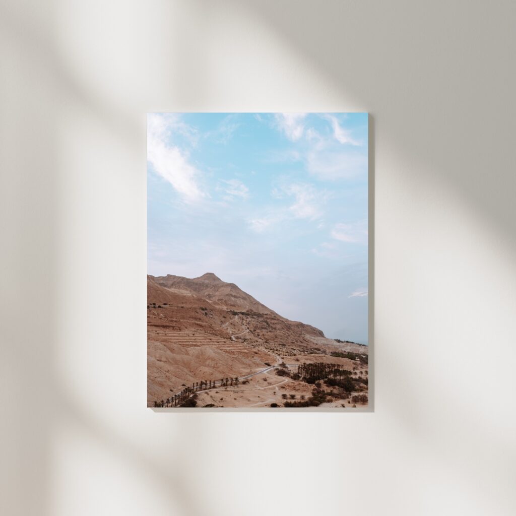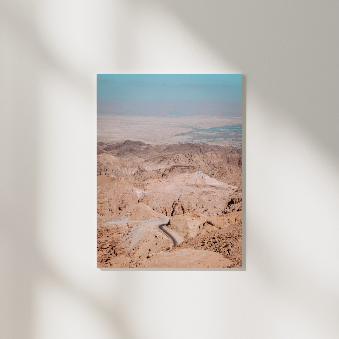 Das Bild zeigt eine einsame Straße, die sich durch die karge Wüstenlandschaft des Dana Nationalparks in Jordanien schlängelt. Nicht viele Touristen verschlägt es dorthin, nur ab und zu sieht man ein Auto die fast unwirkliche Landschaft passieren. Im Hintergrund flirrt der salzige Dunst des Toten Meeres und verbindet sich sanft mit dem Blau des Himmels.
