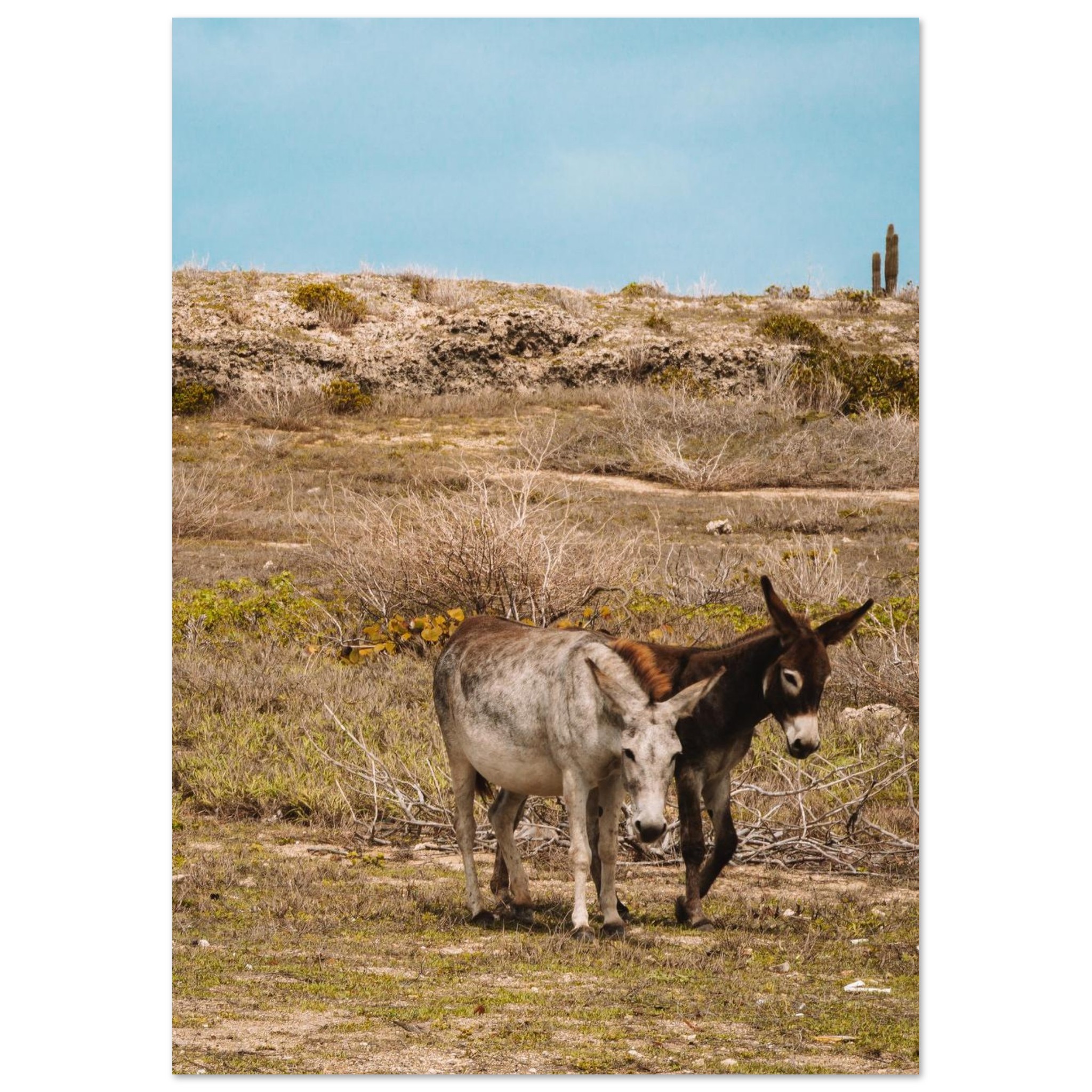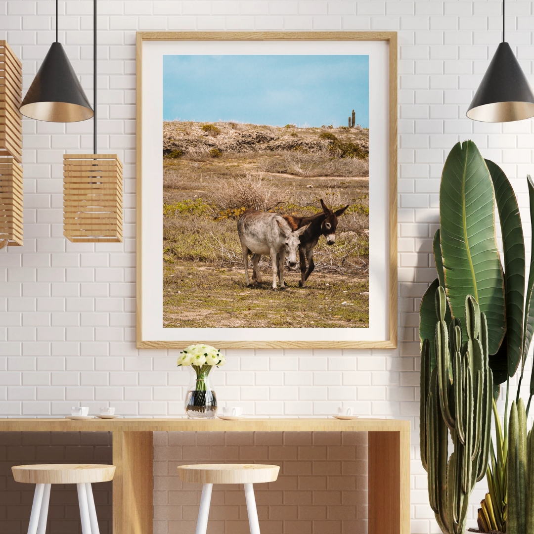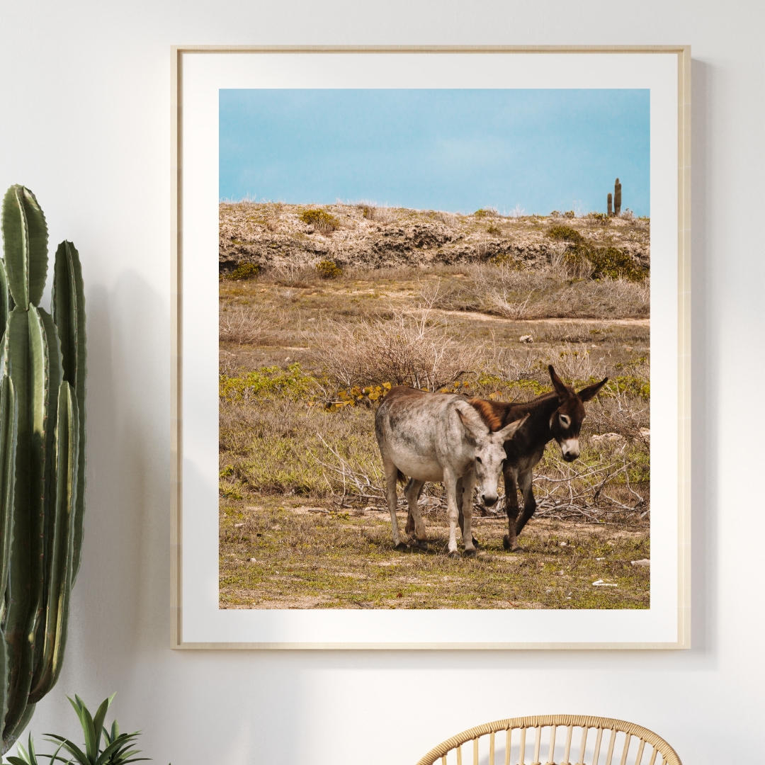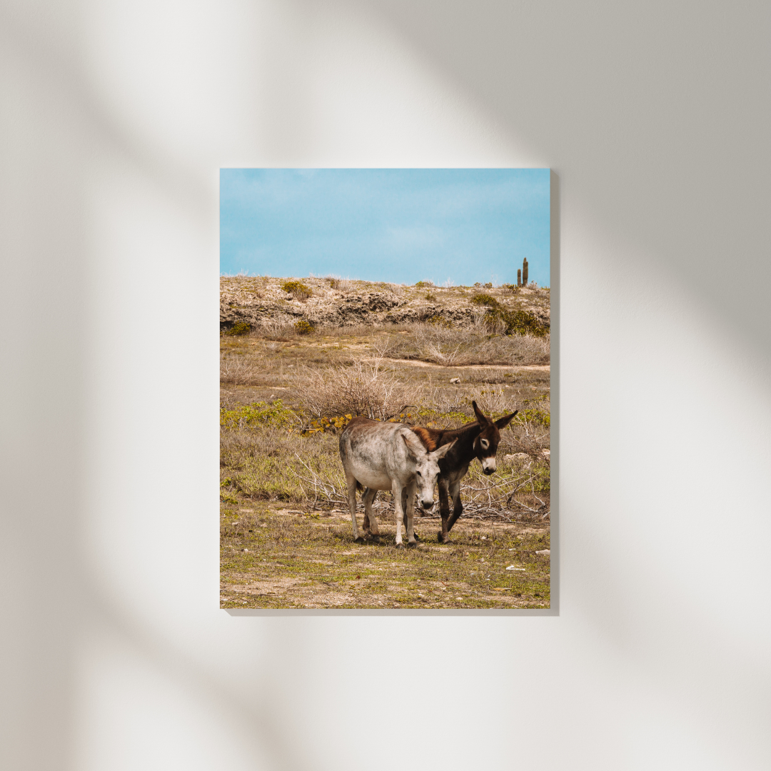 Zwei Esel stehen nebeneinander in der trockenen Landschaft von Aruba. Die Umgebung wirkt karg, der Himmel klar, das Licht warm. Die Tiere wirken ruhig und fast stoisch in der weiten Ebene, genau wie man es von Eseln erwartet 🙂 In jedem Fall zeigen sich die beiden Esel kooperativer als ihr tierischer Freund unseres KISS MY ARSE-Posters.