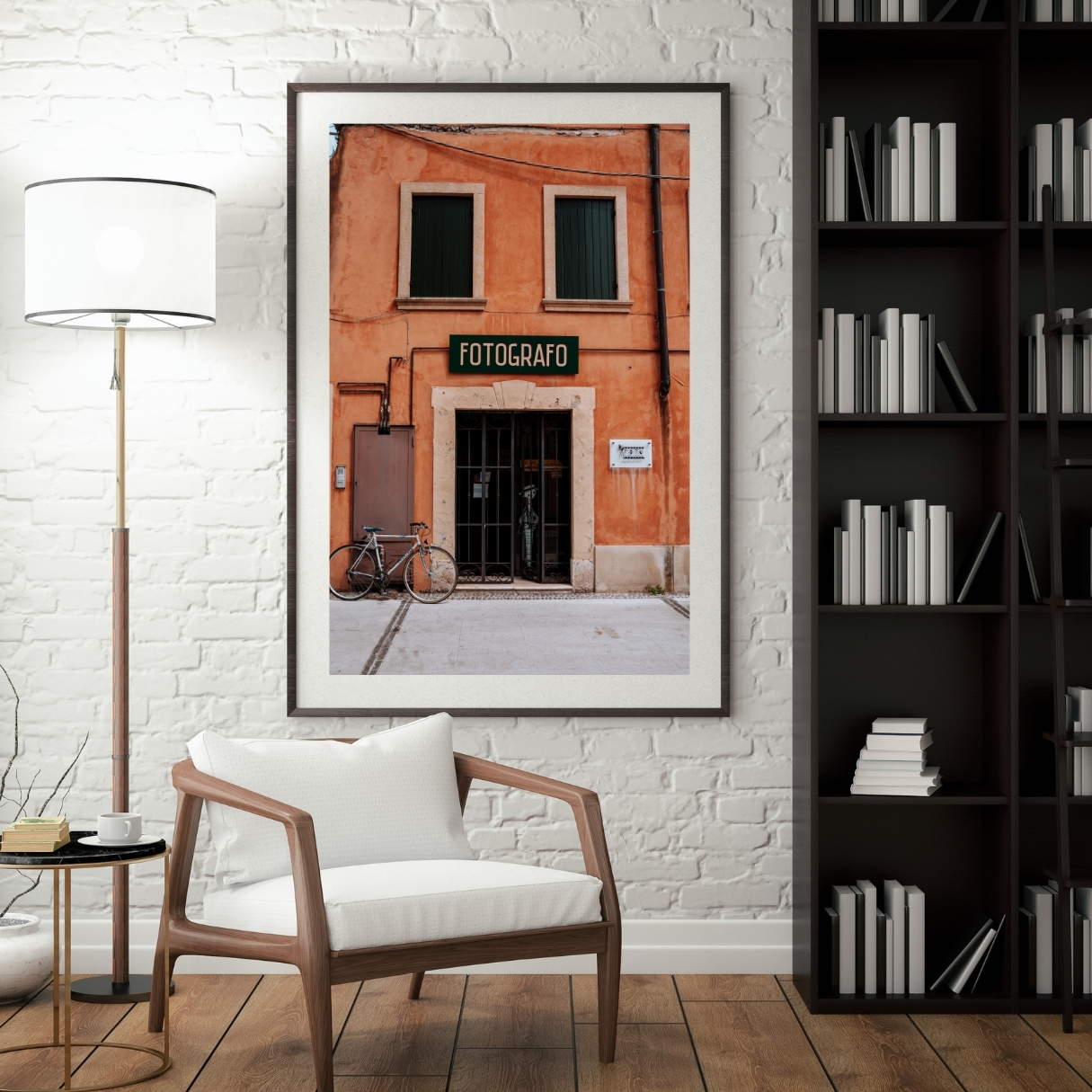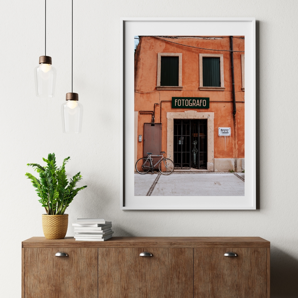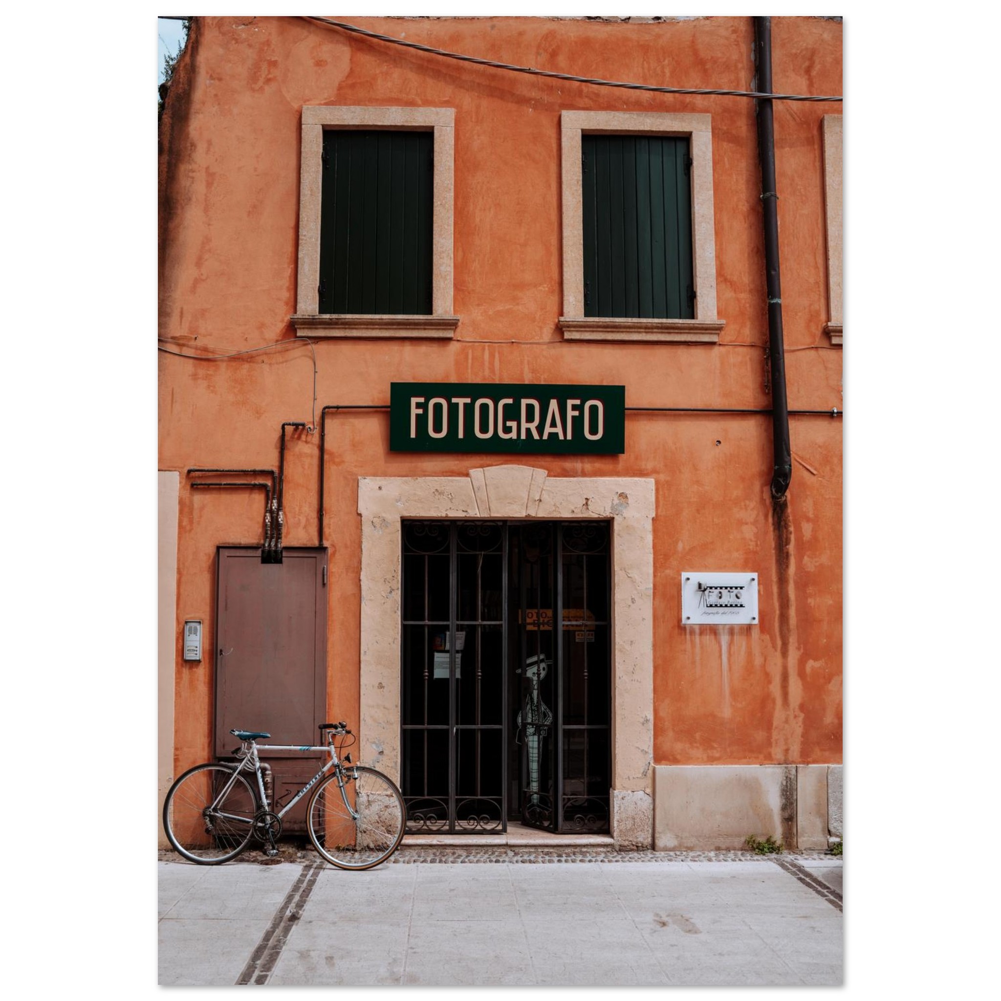Die orangerote Fassade eines Hauses in der Altstadt von Valeggio sul Mincio leuchtet im ruhigen Mittagslicht, daran prangt das alte Schild eines Fotografiegeschäfts. Die schwere Eingangstür ist geschlossen, an der Hauswand lehnt ein Fahrrad, die Straße wirkt still…als wäre diese Szene seit Jahrzehnten nicht verändert worden.