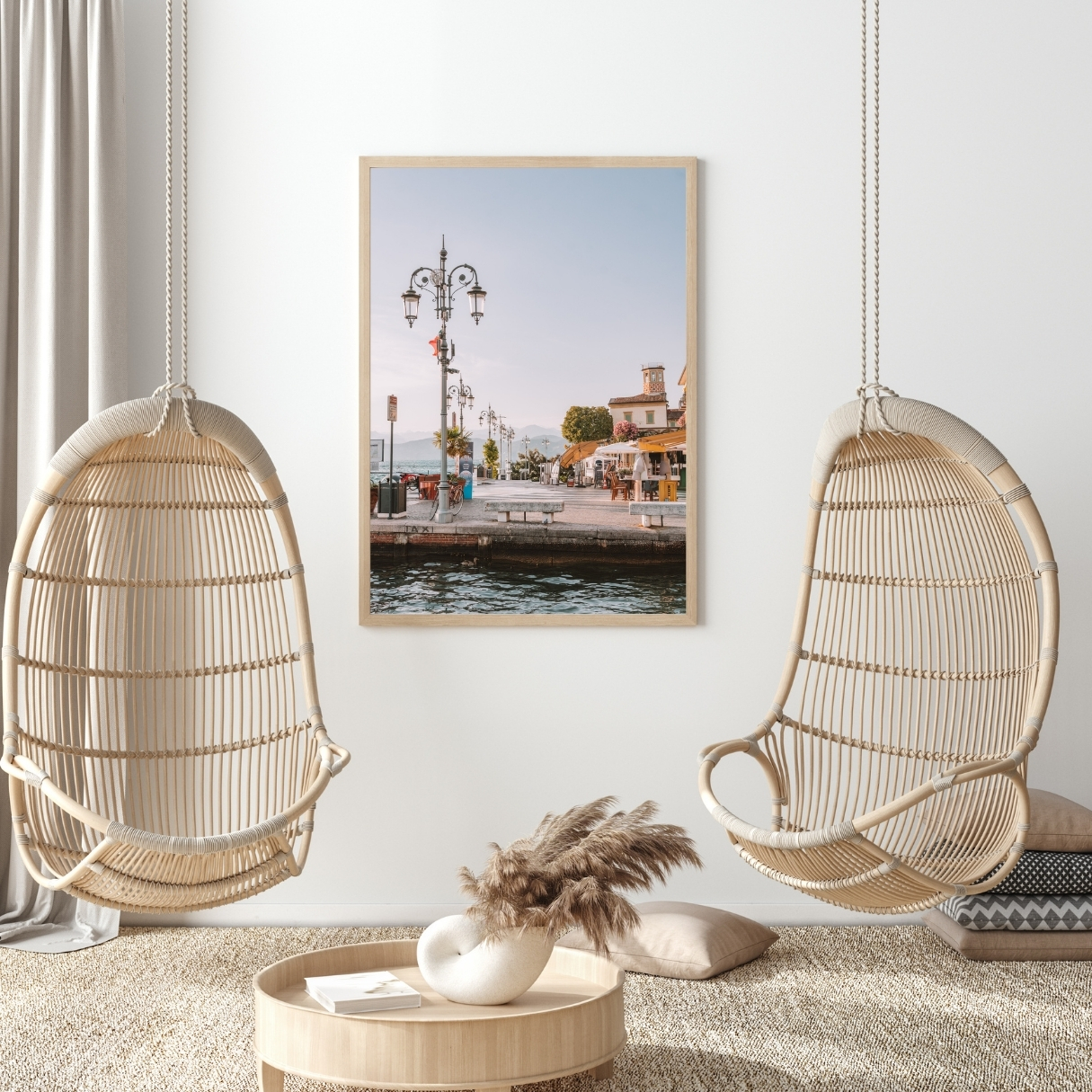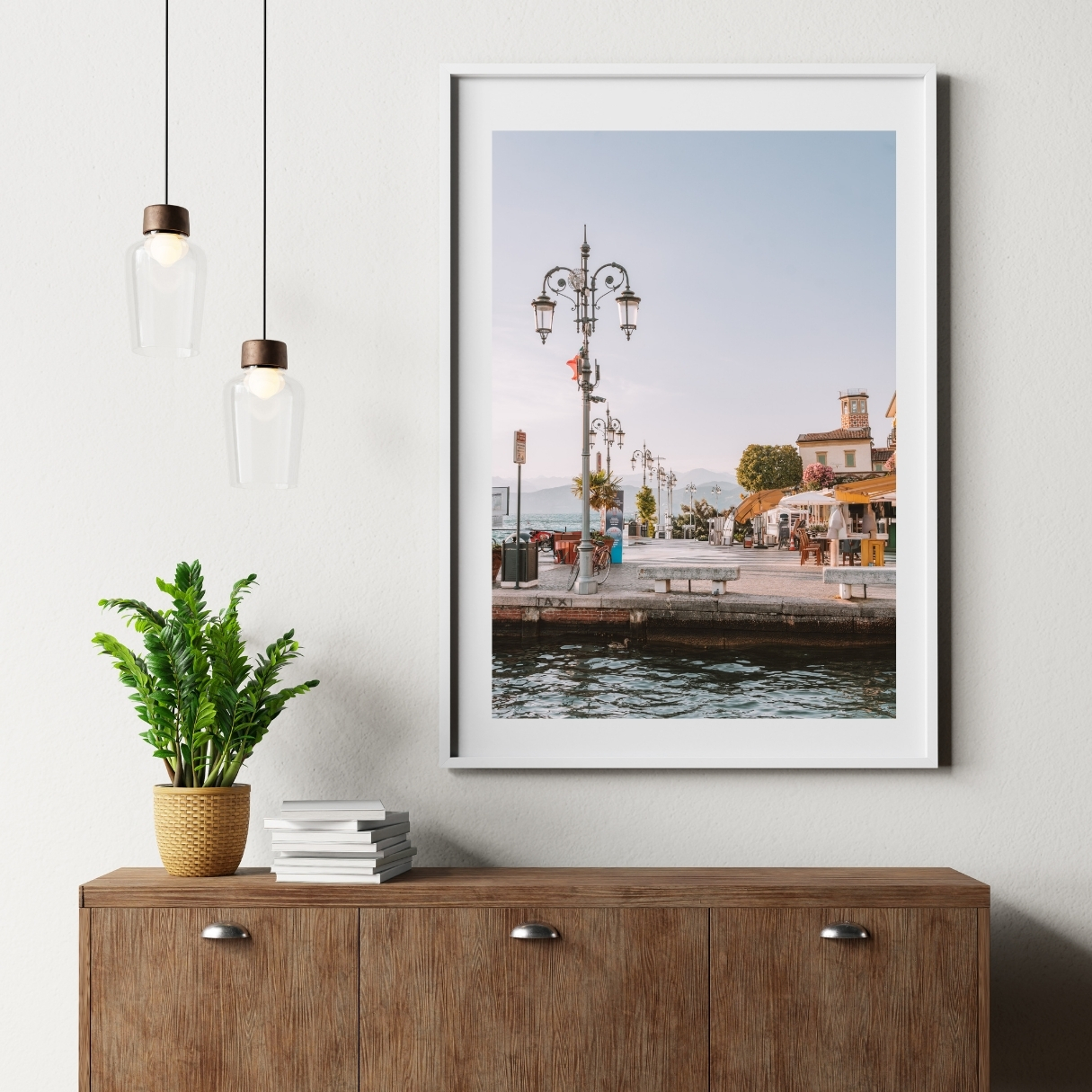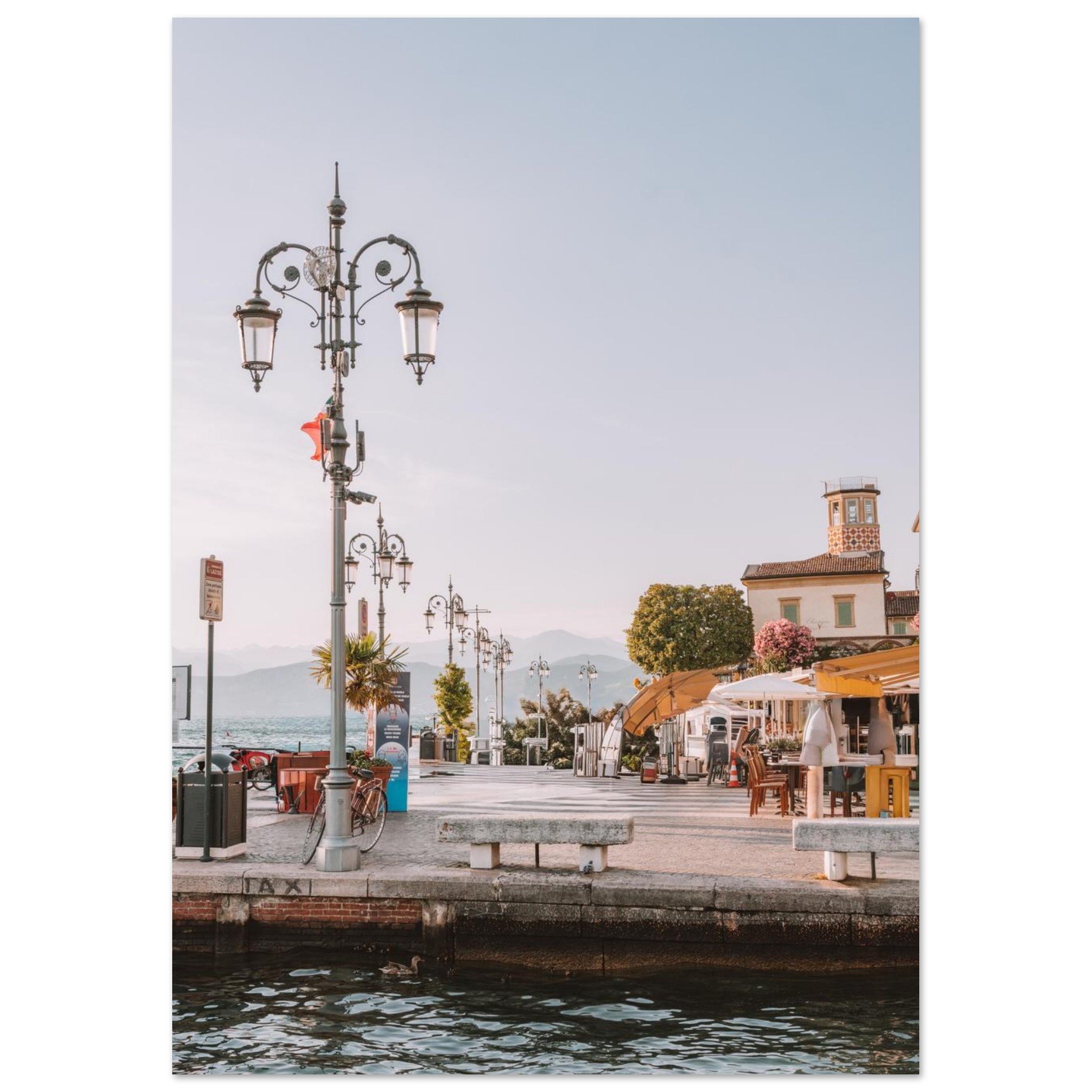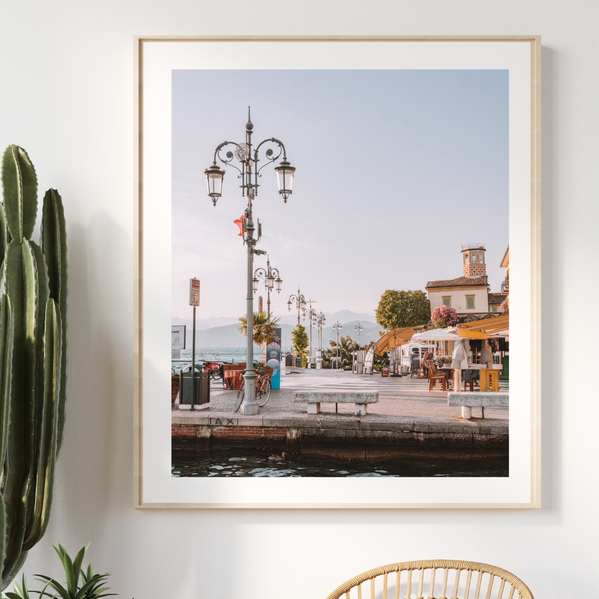Diese Fotografie wirkt beruhigend und bringt eine zurückhaltende, nostalgische Atmosphäre in den Raum. Ideal für Bereiche, in denen Ruhe und weiches Licht wirken dürfen, z. B. in einer Leseecke oder in deinem Schlafzimmer. Ein Reiseposter, das den Gardasee von seiner stilleren Seite zeigt.
