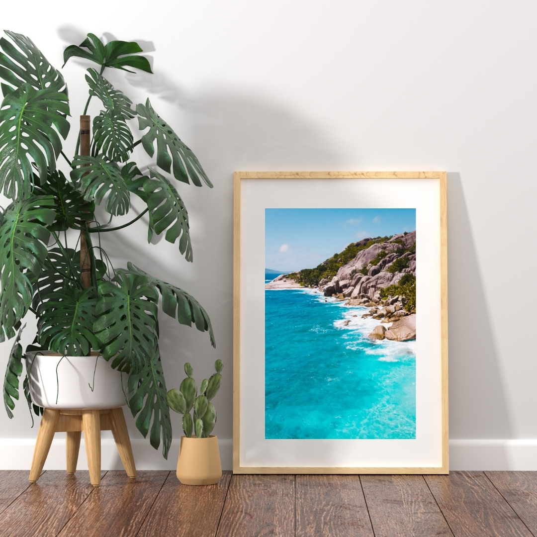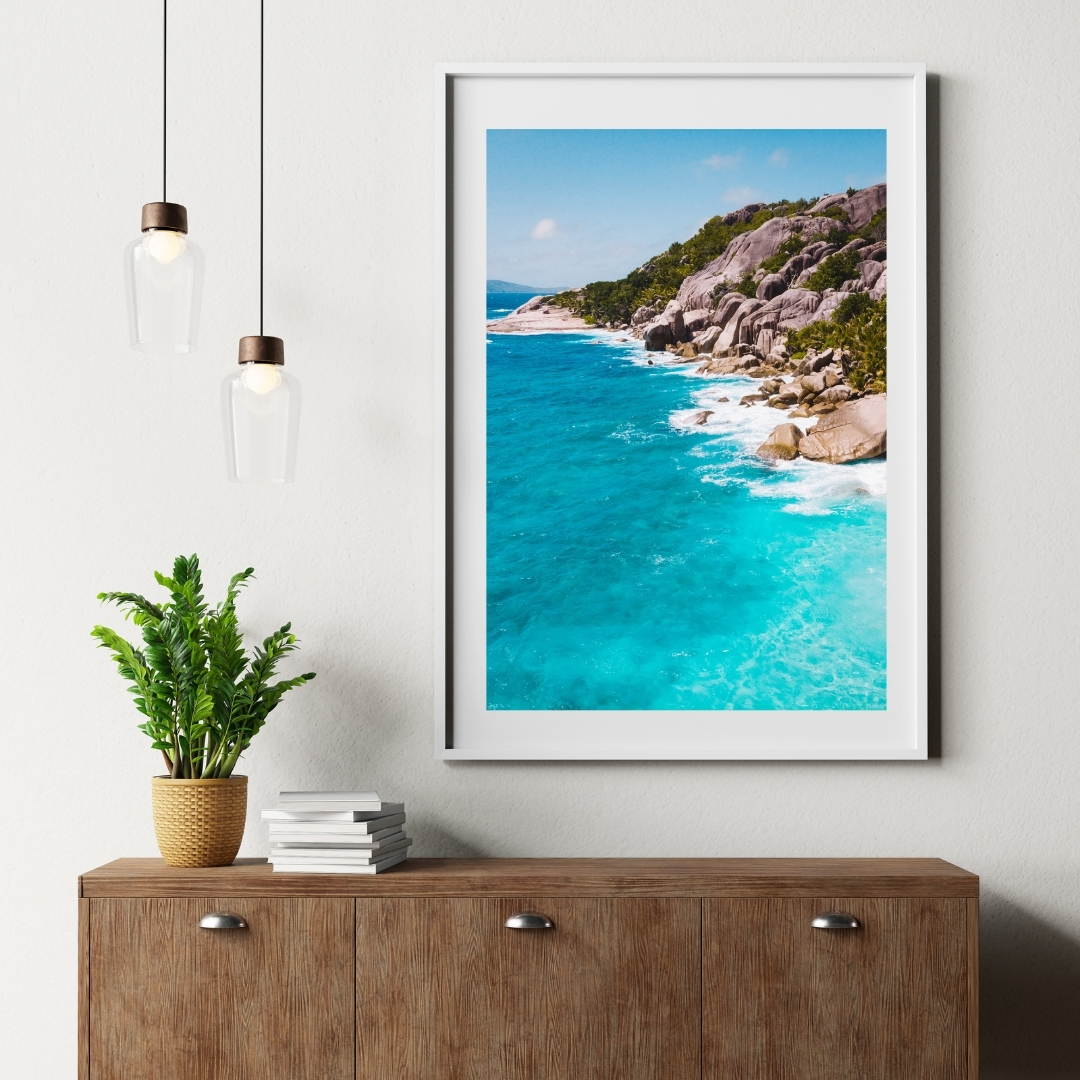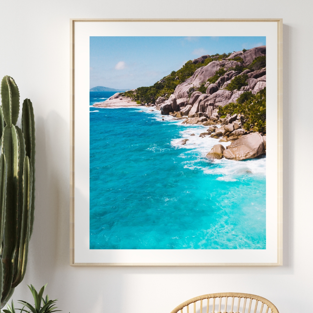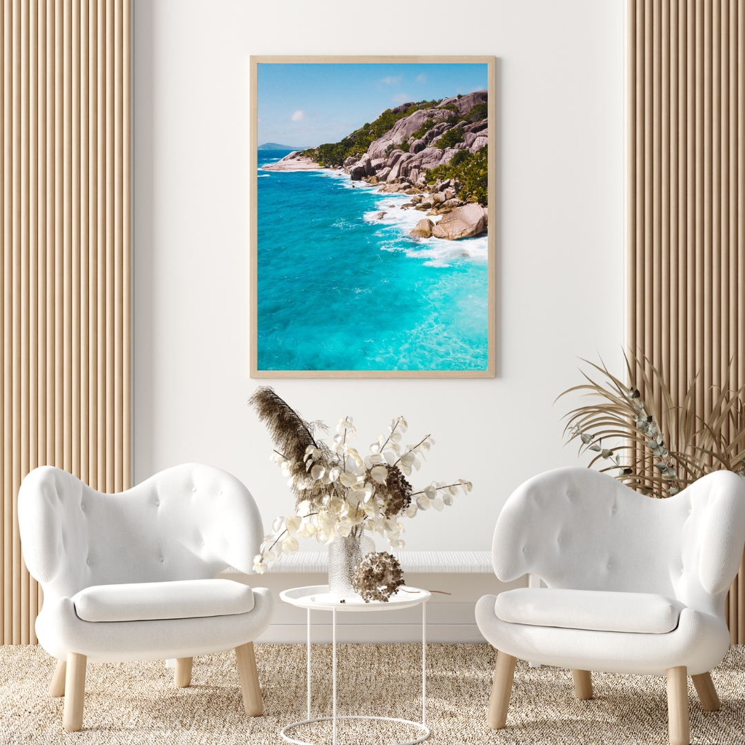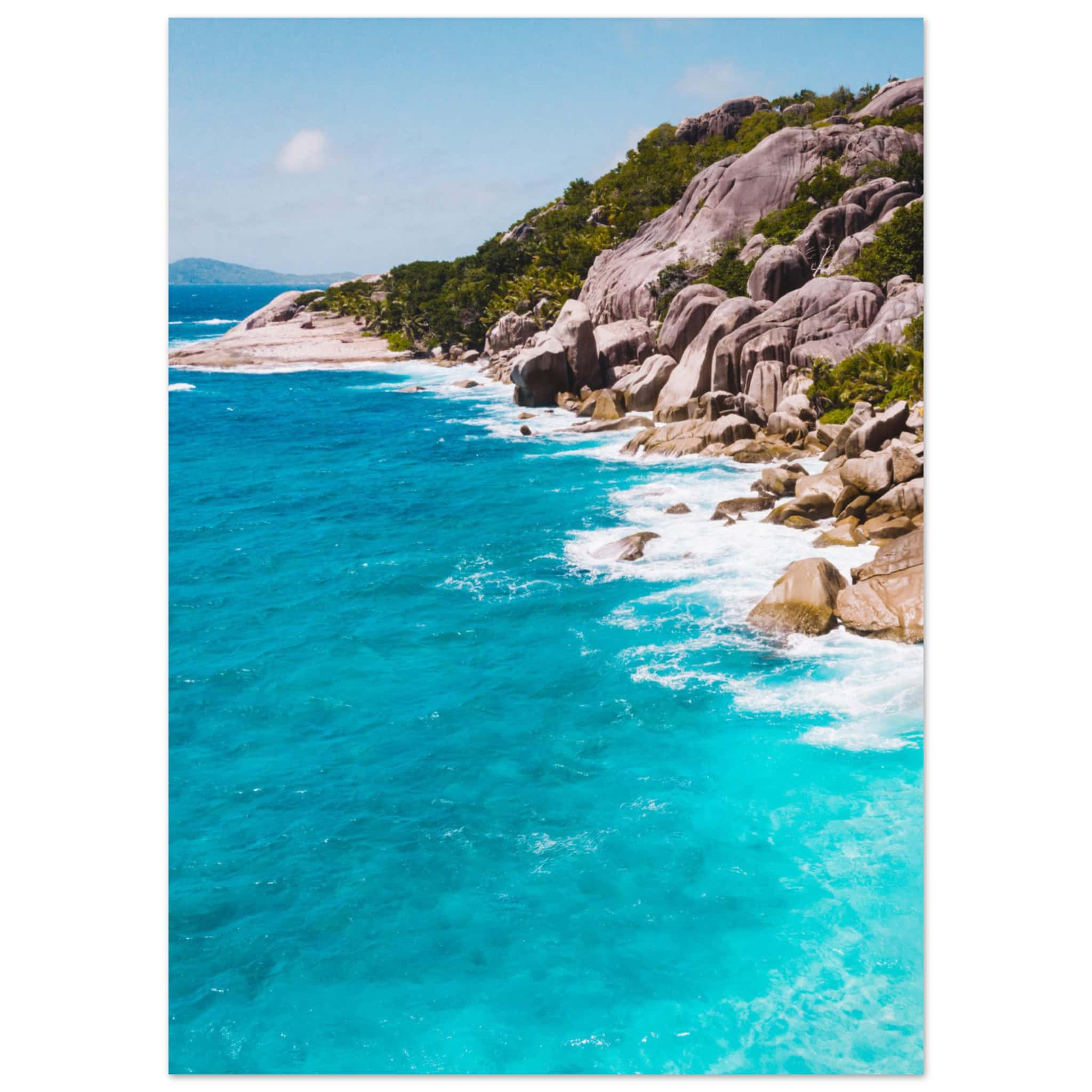 Poster mit Drohnenfotografie der Küstenlinie der Insel Grand Soeur, Seychellen. Die Insel befindet sich in Privatbesitz und beherbergt einen der schönsten Strände der Seychellen. Sie ist ein einsames Paradies aus Puderzuckersand, wilden Palmenwäldern und gigantischen Felsen – und du kannst dir ein kleines Stück von diesem exklusiven Tropenparadies nach Hause an deine vier Wände holen <3