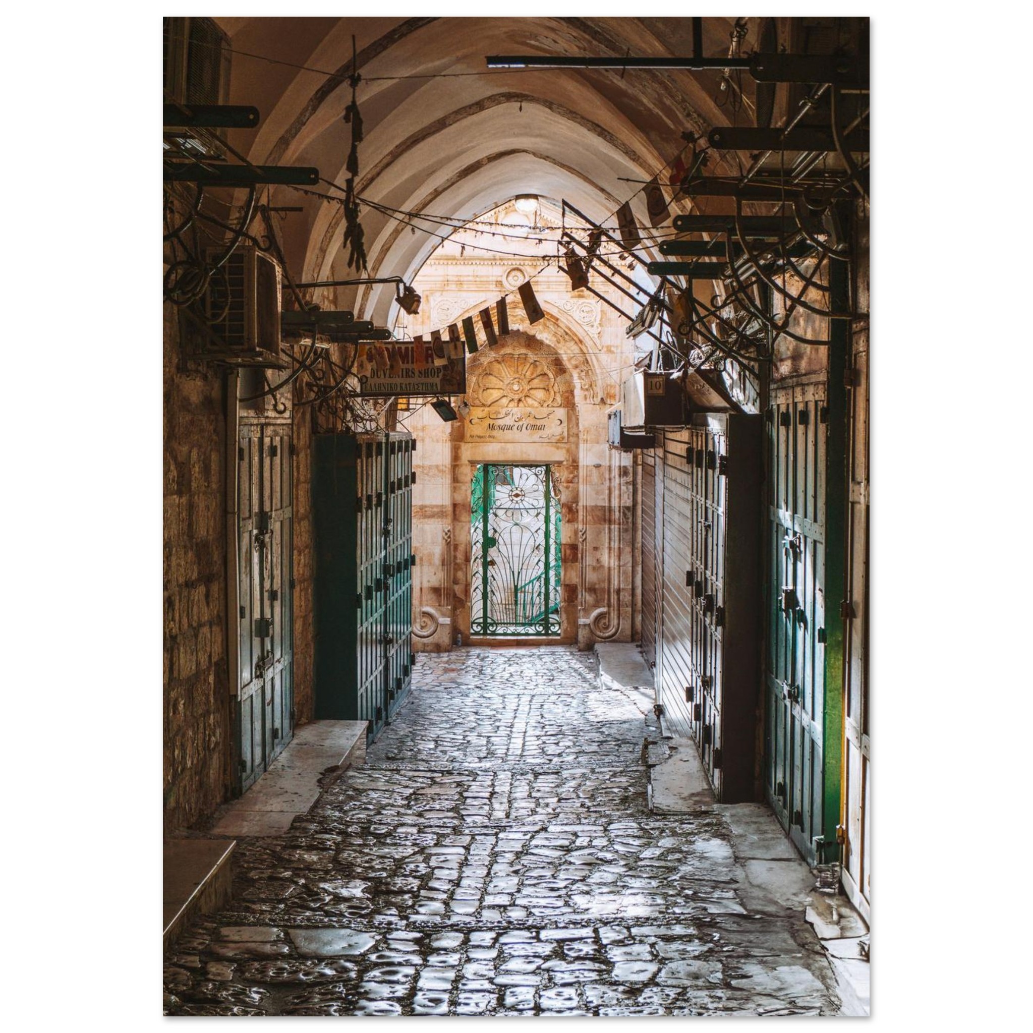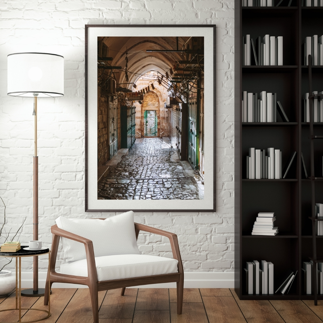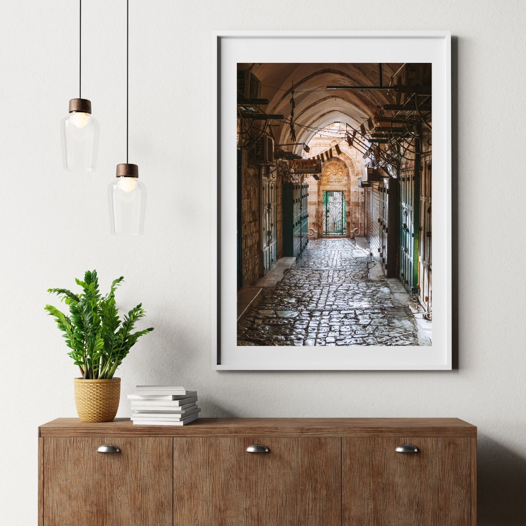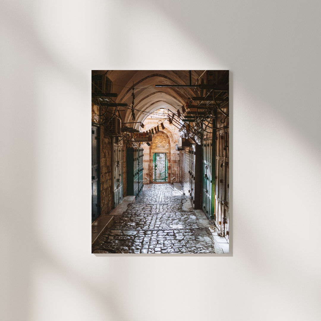 Die Aufnahme zeigt eine leere Marktgasse am Morgen in der Altstadt von Jerusalem, Israel. Später am Tag pulsiert an diesem Ort das Leben und es herrscht buntes Markttreiben, doch in den frühen Morgenstunden sind die Altstadtgassen ruhig und verlassen.