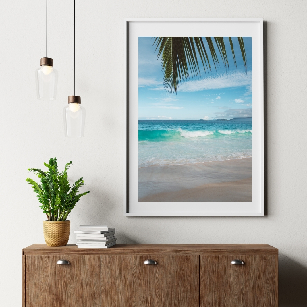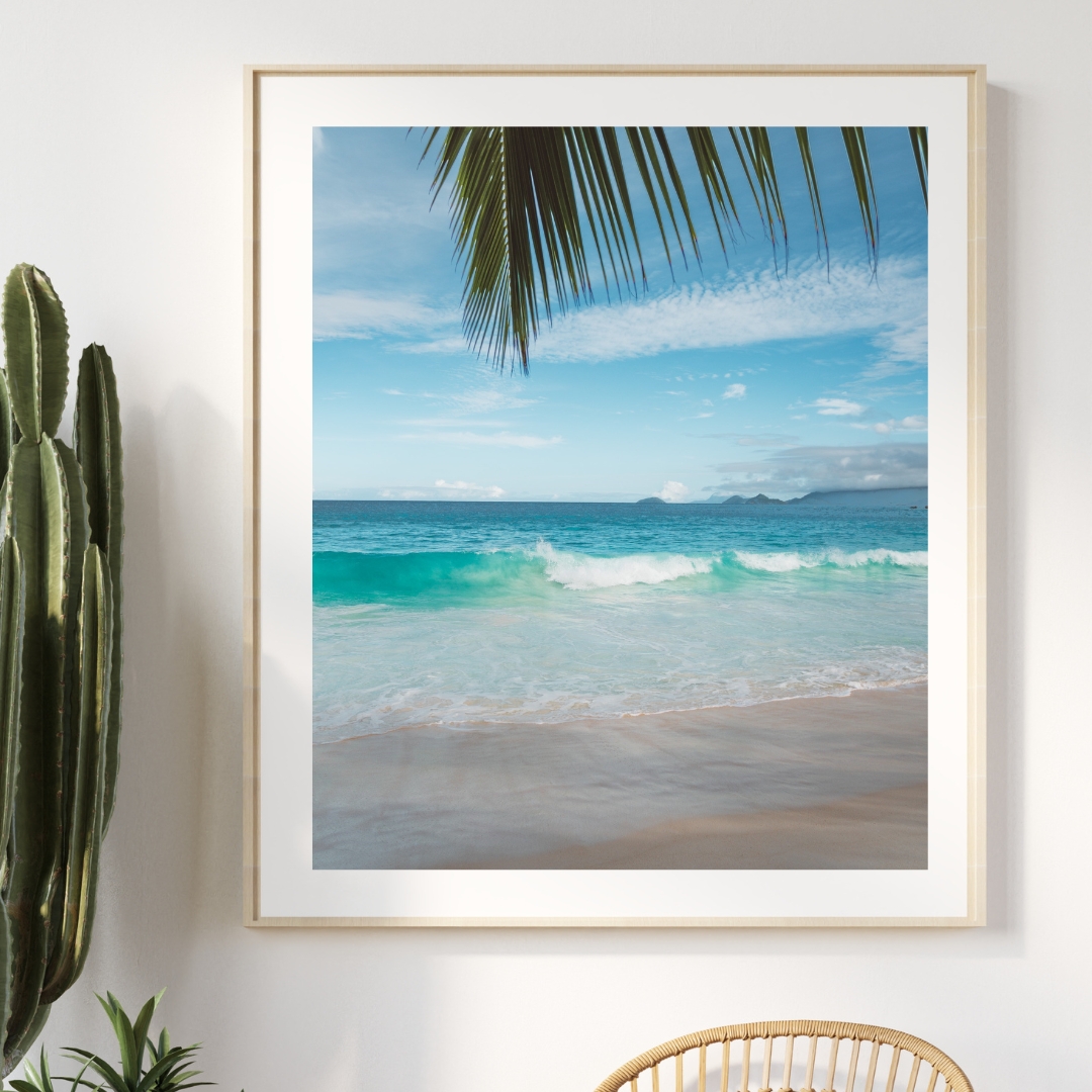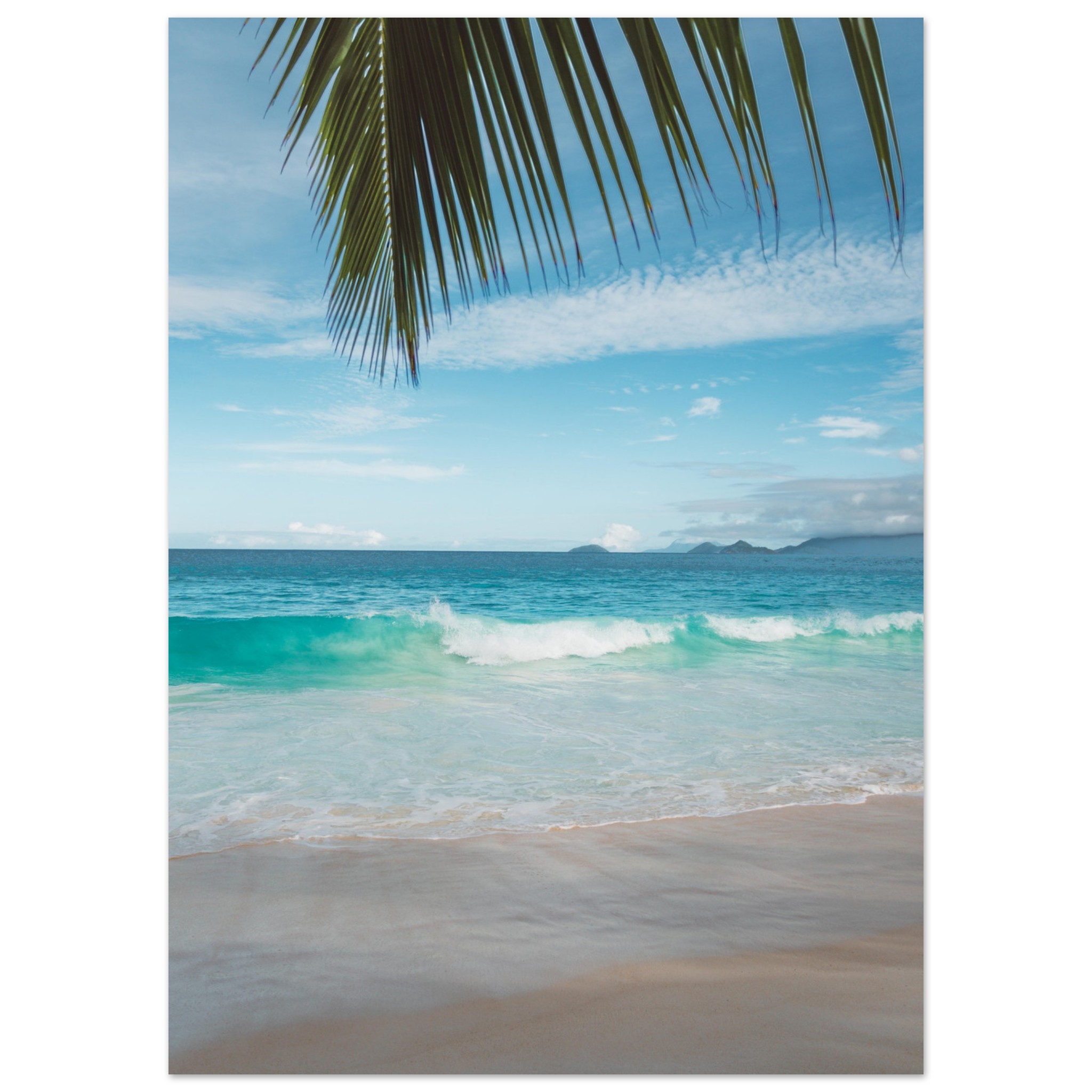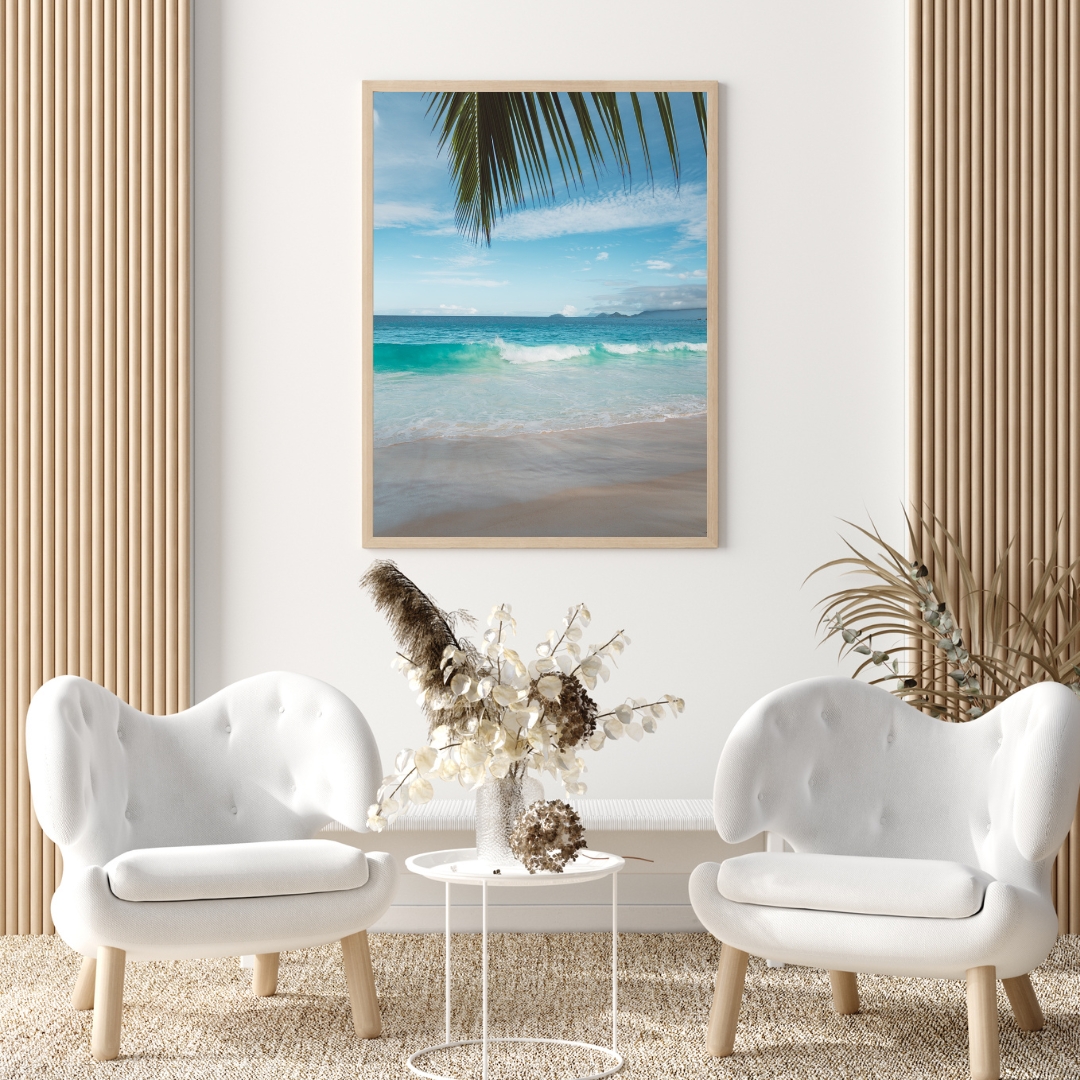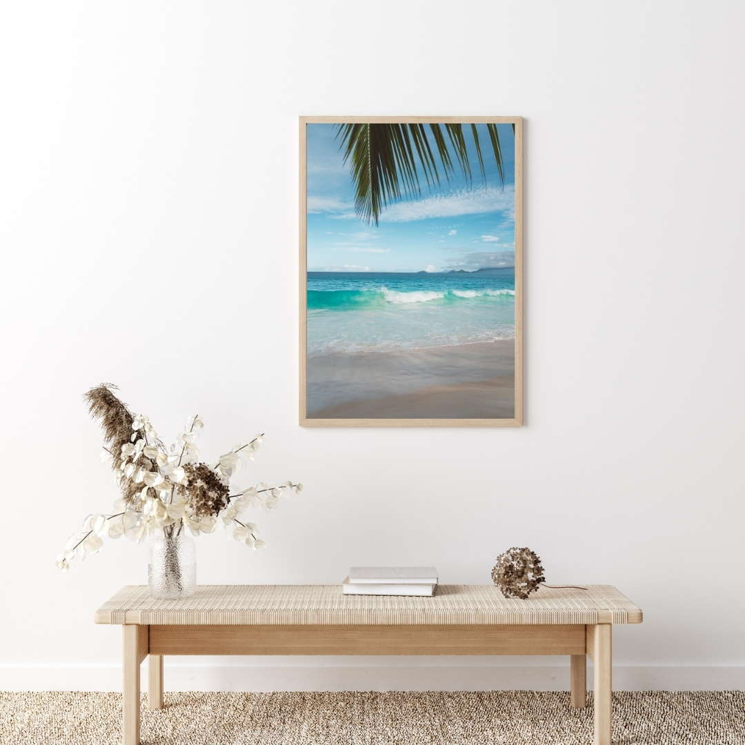 Fotografie eines Traumstrandes auf den Seychellen mit weichem Sand, türkisblauem Meer und einem grünen Palmenblatt, das ins Bild hineinragt. Die sanften Farben machen dieses Wandbild zum perfekten tropischen Poster.
