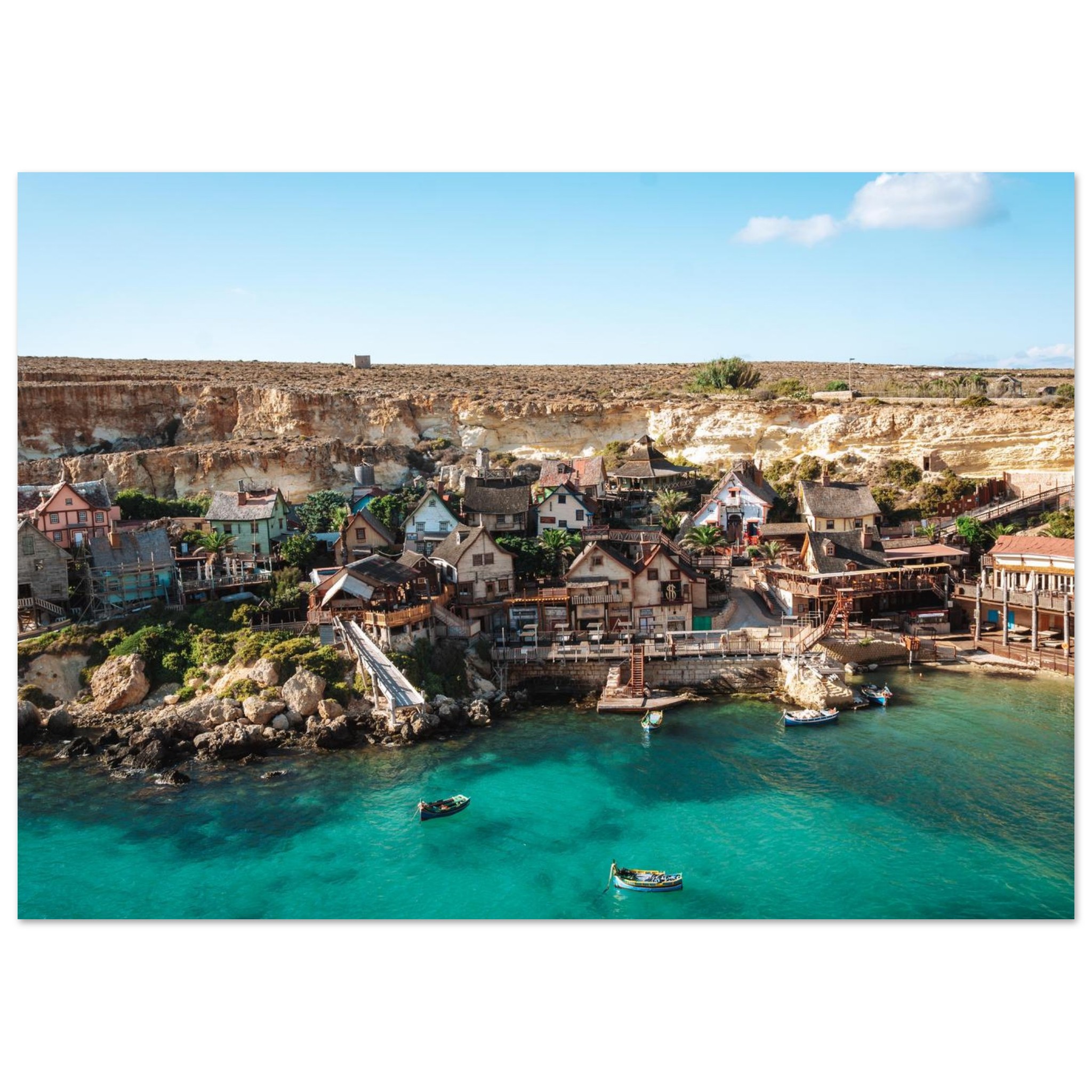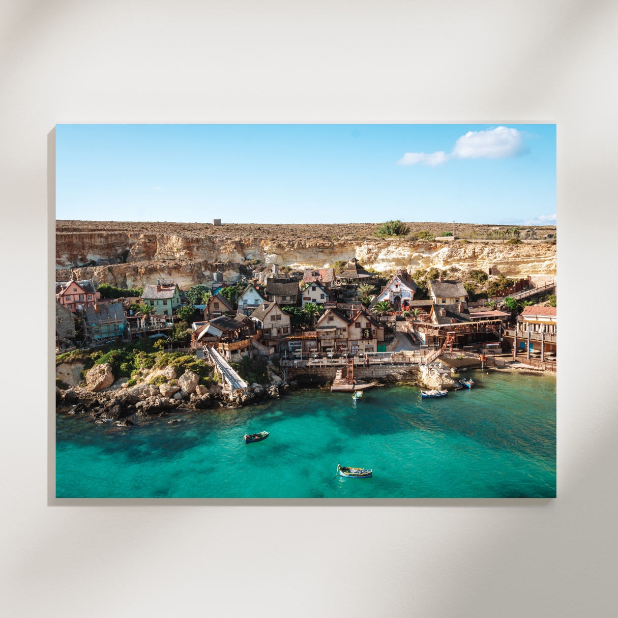 Das ehemalige Filmset von Popeye ist eines der bekanntesten Motive von Malta. Es liegt direkt an der Küste und hebt sich mit seinen bunten Häusern deutlich von der Landschaft ab. Das Meer leuchtet türkisgrün, die Farben wirken verspielt, ohne ins Künstliche zu kippen.
