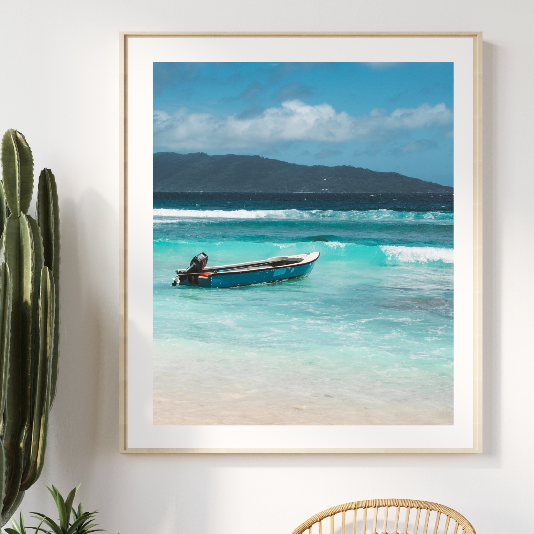 Das Bild zeigt ein einsames Boot an einem Strand auf Cousin Island, einer Seychelleninsel inmitten des indischen Ozeans. Das unruhige Meer formt ein imposantes Spiel aus unterschiedlichen Blau-Schattierungen, im Hintergrund sind die sanften Hügel der Nachbarinsel zu sehen.